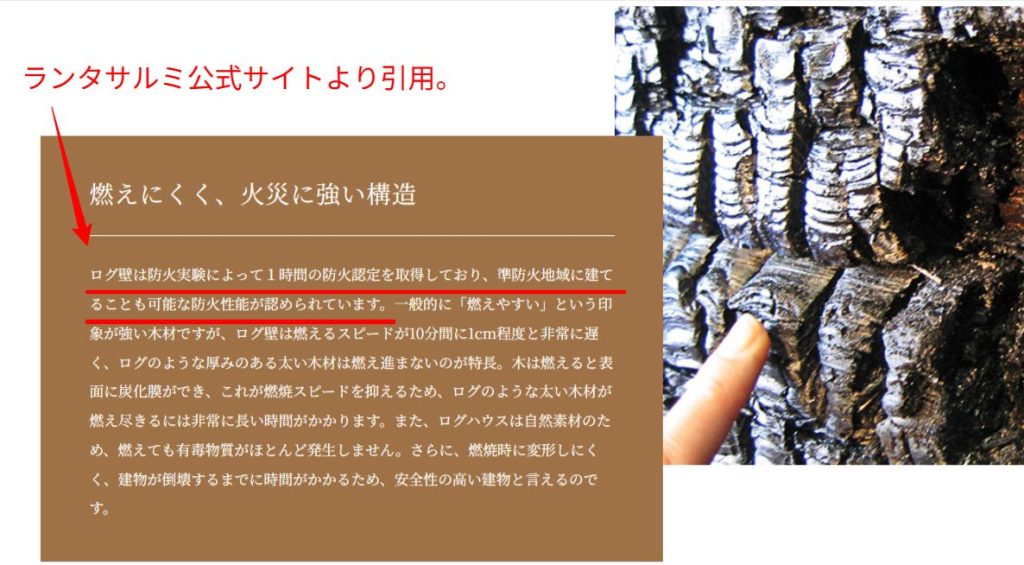 「ログハウスは木造だから火に弱い」と思われがちですが、太いログ材は表面が炭化して酸素の取り込みを妨げるため、燃焼速度が遅いという特性があります。ランタサルミ公式FAQでも、ログ材が防火認定を取得済みであることを明記しています(ランタサルミ公式FAQ)。